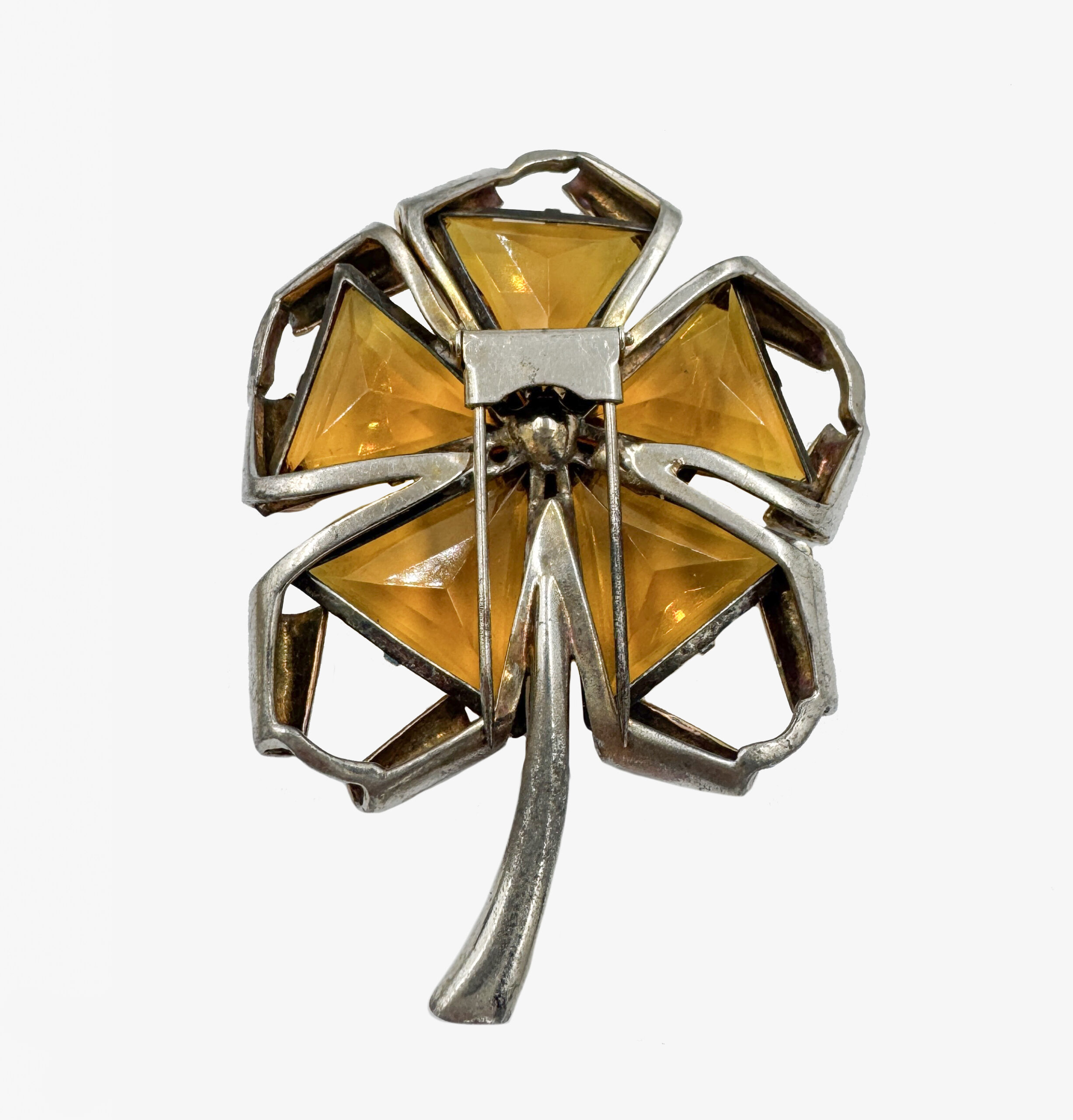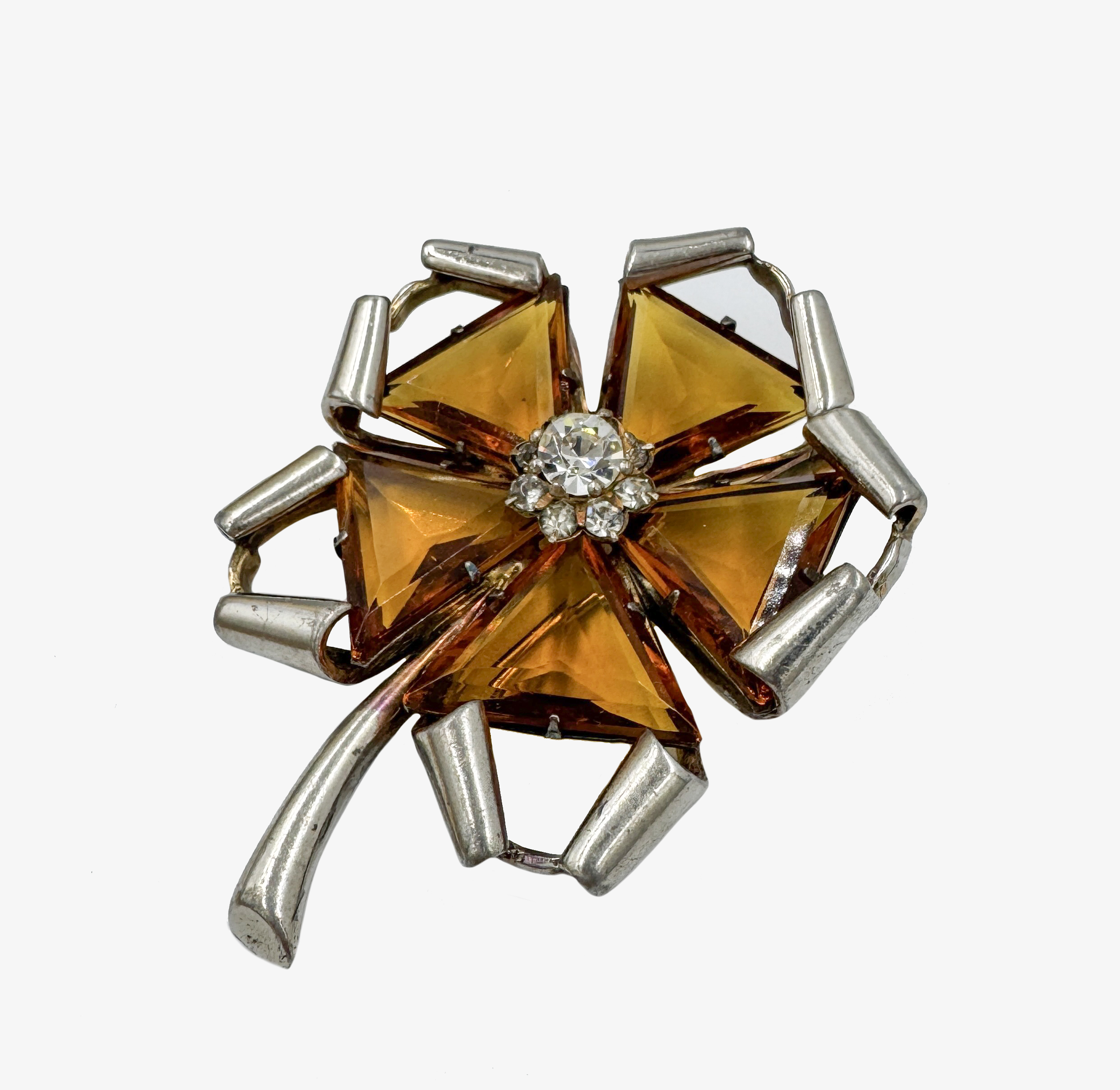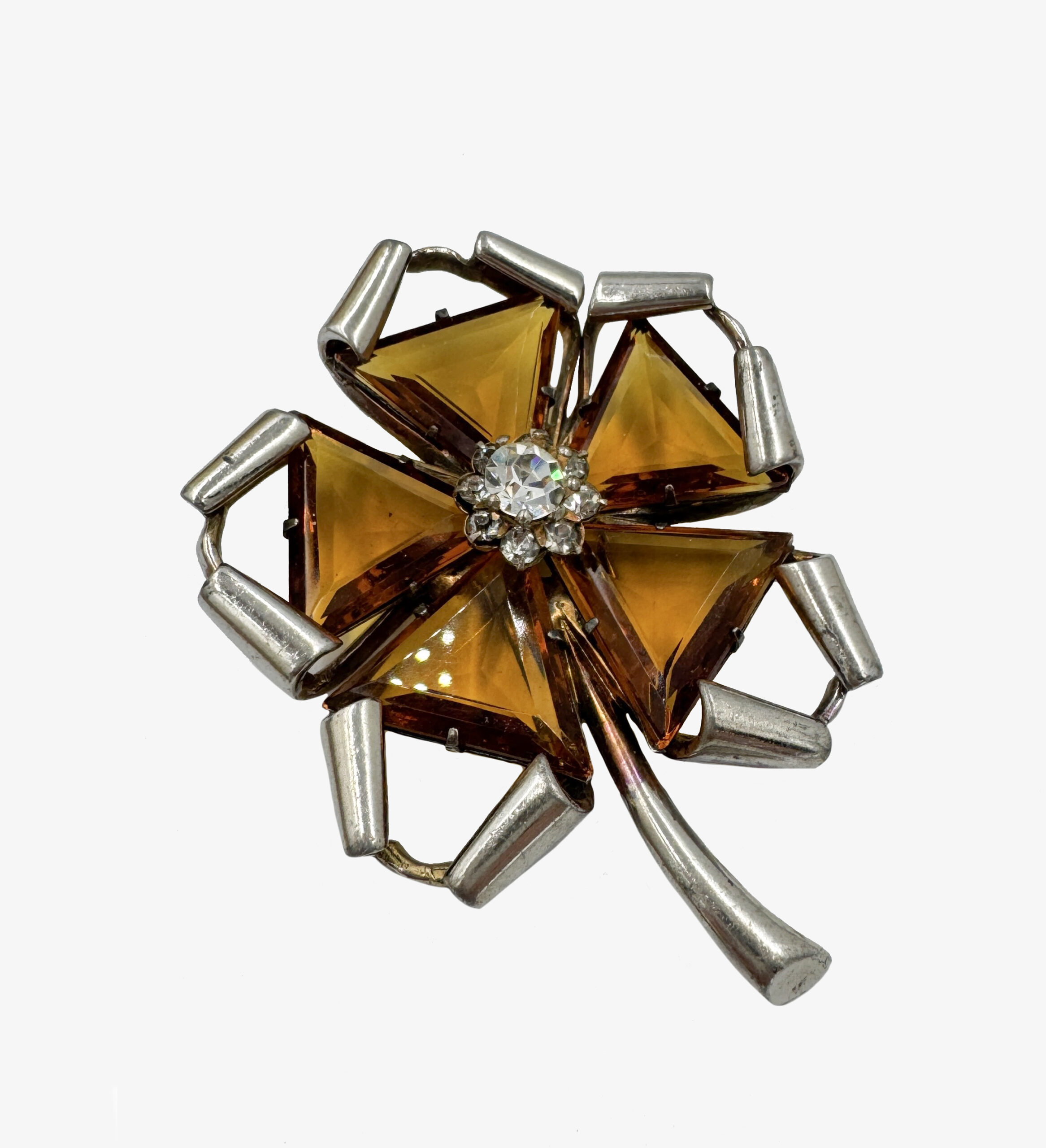 Antique rare fur brooch made in the shape of a flower with topaz-colored glass petals