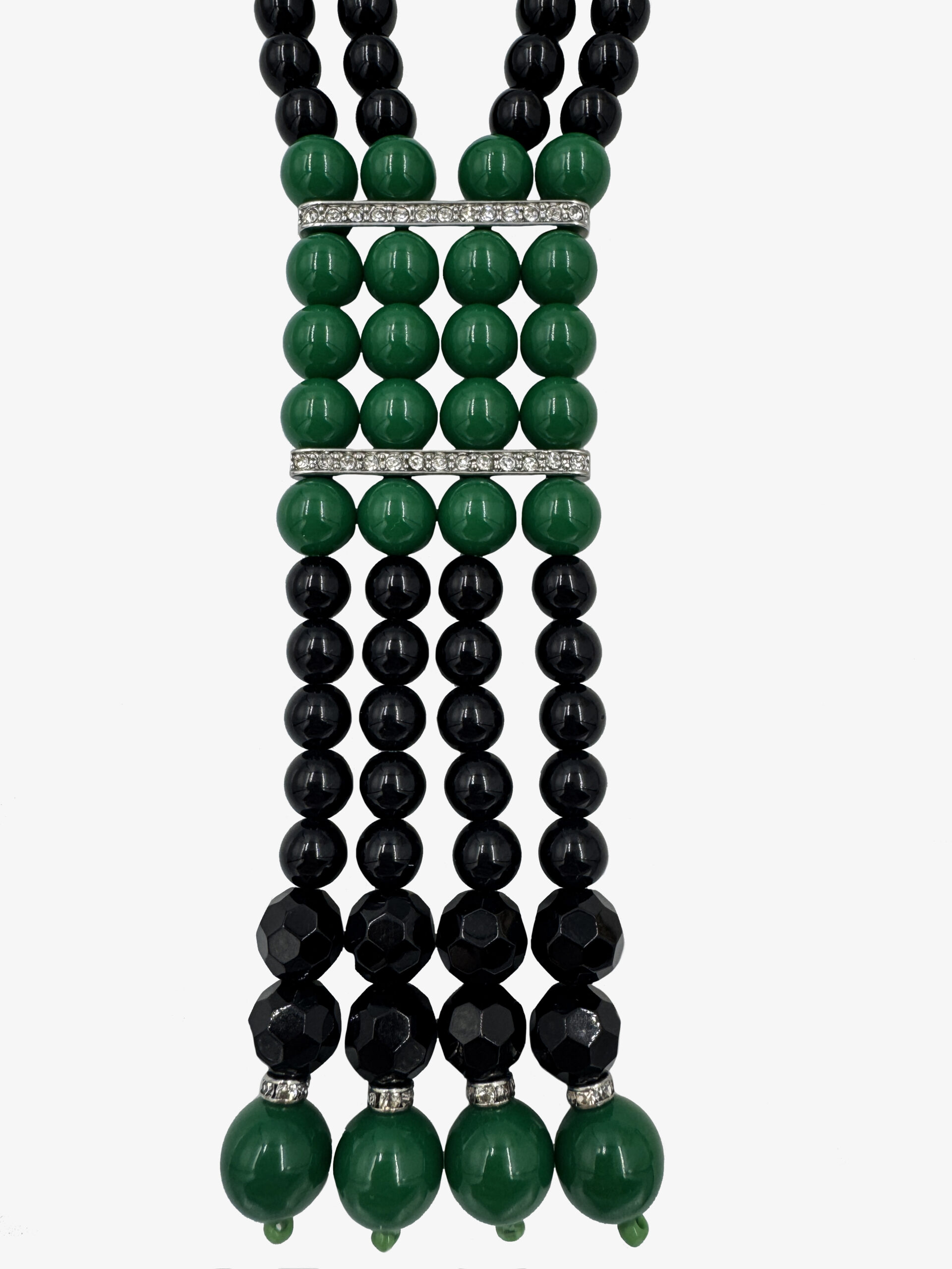 Vintage Kenneth Jay Lane art deco necklace made of black and green beads, with rhinestone inserts